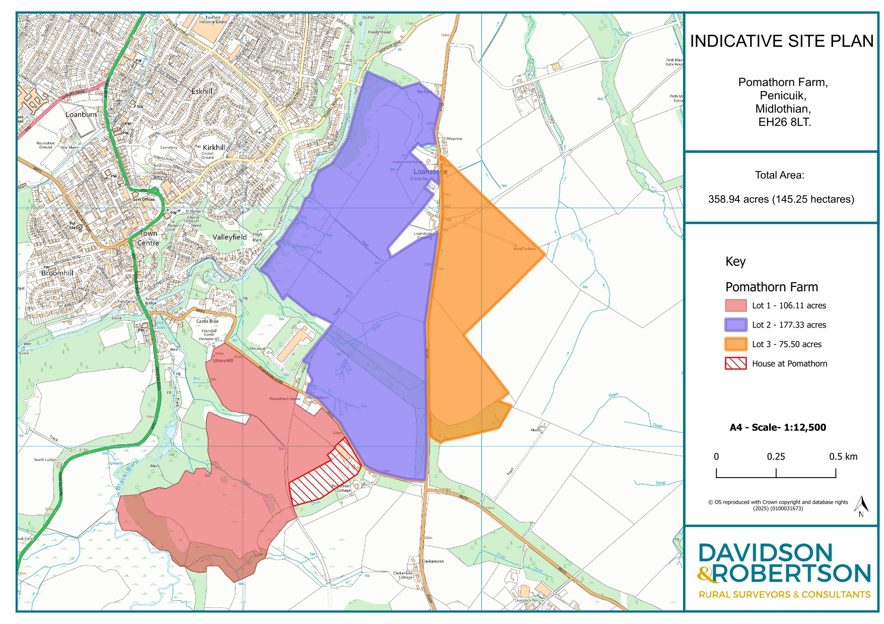 Pomathorn Farm is a well-located livestock farming unit extending to approximately 358.94 acres (145.26 hectares). Offered for sale as three distinct plots of land or farm as a whole. Situated just a quarter of a mile from Penicuik and two miles from Auchendinny, the property lies within easy reach of Edinburgh, making it an attractive opportunity for agricultural investment. The land is predominantly permanent pasture, providing excellent grazing potential, and is very well maintained. The farmhouse may be available by separate negotiation.